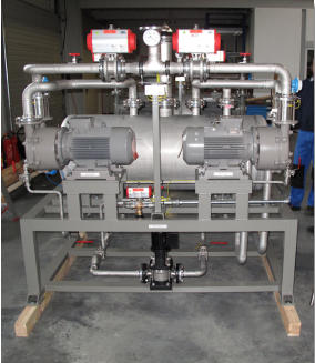 Vakuumkompaktanlagen speziell für Chargen bzw. Batch-Produktion, bei der Herstellung flüssiger Produkte.Die vielfach erfolgreich im Einsatz befindlichen Ausführungen verbinden Wirtschaftlichkeit mit der notwendigen hohen Verfügbarkeit, unter Berücksichtigung der örtlichen Gegebenheiten.Anlage mit zwei Vakuumpumpen die sowohl parallel zur raschen Vorevakuierung und einzeln für das Prozessvakuum betrieben werden können.